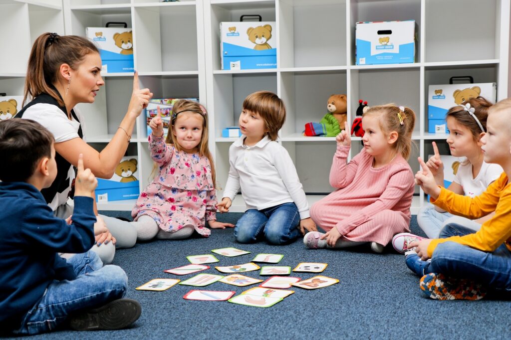 I właśnie takie same warunki, jakie stworzyłeś Ty, Rodzicu, my odwzorowujemy na zajęciach metodą Teddy Eddie. Łączymy obraz z dźwiękiem, pokazujemy przedmioty i nazywamy je. Mówimy do dzieci po angielsku pełnymi zdaniami. I powtarzamy, powtarzamy, powtarzamy. Śpiewamy piosenki, uczymy się rymowanek, opowiadamy bajeczki.